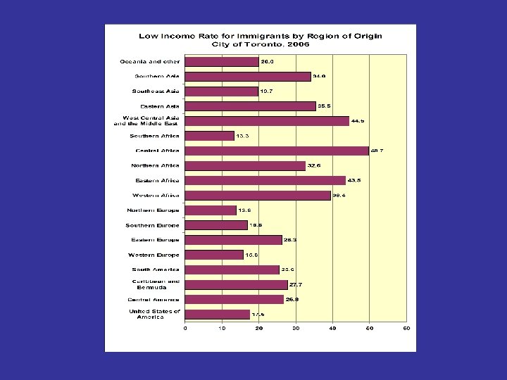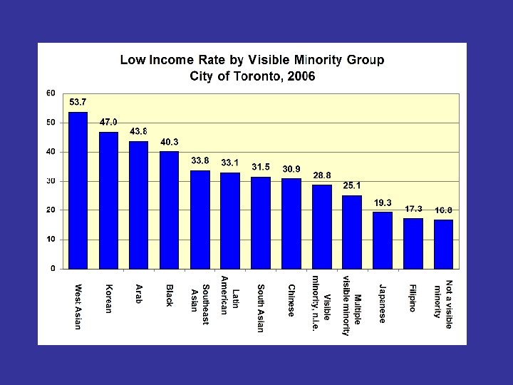 Immigrants and Visible Minorities • One third of visible minority persons had before tax income below the LICO, a rate nearly double that of non-visible minority persons (17%). • Among the 383, 500 low income visible minority persons living in Toronto, thirty-one percent were black, 19% Chinese, 19% South Asian and 7% Latin American. • 63% of low income persons in 2006 were visible minority.
