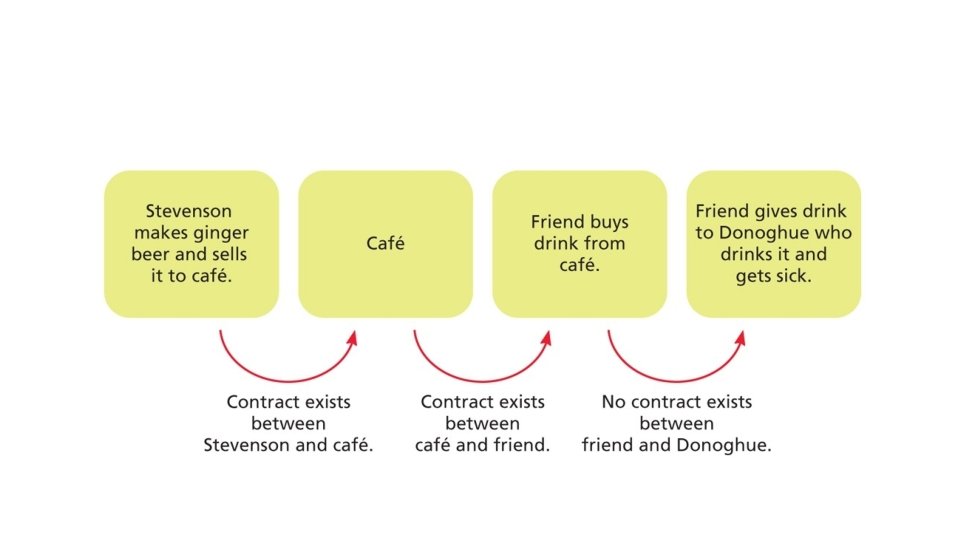 The snail in the bottle case — Donoghue v. Stevenson • In August 1928, May Donoghue and a friend went to a café where the friend purchased a bottle of ginger beer for Donoghue to drink. The drink was in an opaque glass bottle, so it was impossible to see the contents of the bottle from the outside. Some of the ginger beer was poured over icecream and Donoghue consumed it. When the rest of the drink was poured, the decomposed remains of a dead snail slipped out. As a result Ms Donoghue suffered from severe gastroenteritis and shock. • Ms Donoghue wanted to sue Stevenson, the manufacturer of the soft drink but, at the time of the appeal court hearing (1932), an injured party could only sue if party to a contract. If Donoghue had been the person who actually purchased the drink, she could have sued in contract law. But, as her friend purchased the drink, Donoghue could not rely on contract law to recover damages.
