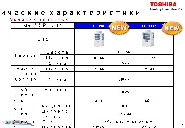 Наружные блоки андартные модели 21 типоразмер MMY-MAP***4 HT 8 380 -415 В Холод Тепло Название HP модели (MMY-) о- Холод Тепло Название - произ вод. (к. Вт) Вид HP модели (MMY-) о- - произ вод. (к. Вт) 8 MAP 0804 HT 8 -E 22. 4 25. 0 30 AP 3014 HT 8 -E 85. 0 95. 0 10 MAP 1004 HT 8 -E 28. 0 31. 5 32 AP 3214 HT 8 -E 90. 0 100. 0 12 MAP 1204 HT 8 -E 33. 5 37. 5 34 AP 3414 HT 8 -E 96. 0 108. 0 14 MAP 1404 HT 8 -E 40. 0 45. 0 36 AP 3614 HT 8 -E 101. 0 113. 0 16 MAP 1604 HT 8 -E 45. 0 50. 0 38 AP 3814 HT 8 -E 106. 5 119. 5 18 AP 1814 HT 8 -E 50. 4 56. 5 40 AP 4014 HT 8 -E 112. 0 127. 0 20 AP 2014 HT 8 -E 56. 0 63. 0 42 AP 4214 HT 8 -E 118. 0 132. 0 22 AP 2214 HT 8 -E 61. 5 69. 0 44 AP 4414 HT 8 -E 123. 5 138. 0 24 AP 2414 HT 8 -E 68. 0 76. 5 46 AP 4614 HT 8 -E 130. 0 145. 0 48 AP 4814 HT 8 -E 135. 0 150. 0 *Модели 5 НР и 6 НР 73. 0 - такие 81. 5 же, как у SMMS 26 AP 2614 HT 8 -E 28 AP 2814 HT 8 -E 78. 5 Вид 88. 0 7