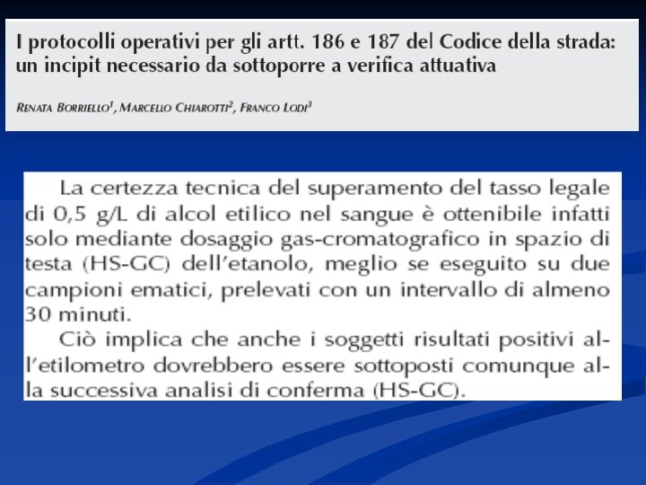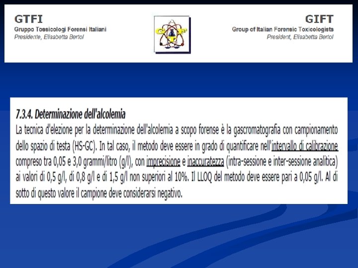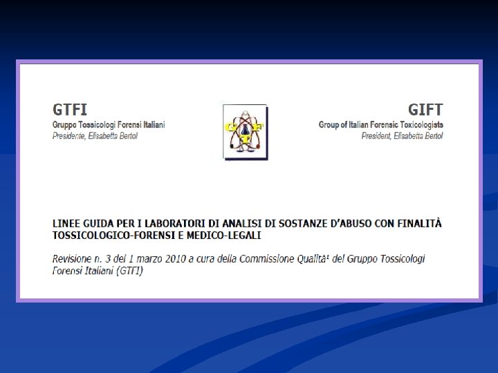 “Qualità “ del dato analitico È necessario uniformare i propri standard analitici alle Linee Guida di Settore Linee Guida internazionali TIAFT ( The International Association of Forensic Toxicologists) SOHT (Society of Hair Testing) EWDTS (European Workplace Drug Testing Society) Linee Guida nazionali GTFI( Commissione Qualità del Gruppo Tossicologi Forensi Italiani)