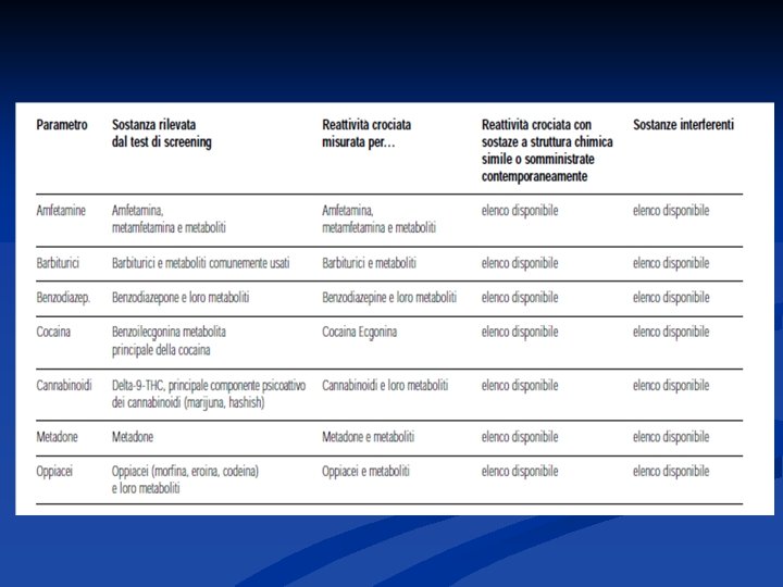 Metodi di screening immunochimici Le metodiche usate per i test iniziali sono generalmente di natura immunochimica: RIA (radioimmunologiche) EIA (immunoenzimiche) FPIA (fluorescenza a luce polarizzata) LIA (lattici ad inibizione di agglutinazione) KIMS (interazione cinetica di microparticelle in soluzione)