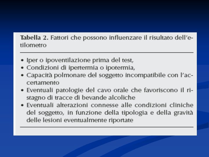 ETILOMETRO Rappresenta una metodica indiretta: la concentrazione di alcol nell’aria espirata (Br. AC) viene convertita in concentrazione di alcool su sangue (BAC) con l’assunto che esiste rapporto alveolo capillare 1: 2300