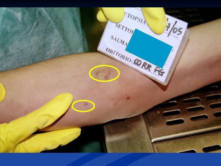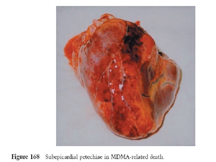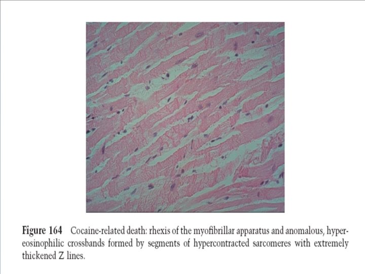 Reperti nella intossicazione acuta e cronica n Esterni: n n Perforazione setto nasale Necrosi circoscritta (ev o sc) Segni di agopuntura Interni: n n n n Edema cerebrale Edema polmonare Stasi poliviscerale Fibrosi polmonare Emorragie interstiziali miocardiche Infarto acuto del miocardio Necrosi a bande di contrazione