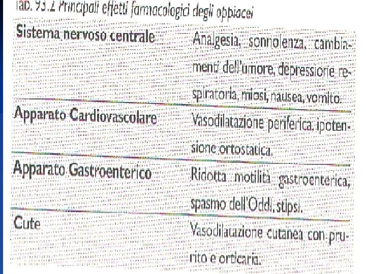 Gli effetti principali si estrinsecano prevalentemente a carico del sistema nervoso centrale, determinando analgesia, sonnolenza, variazioni d’umore, offuscamento mentale, depressione respiratoria centrale.