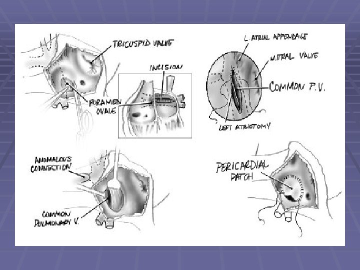 2. Cardiac Type § Coronary sinus connection Classic repair: · Create common large interatrial connection by incising coronary sinus septum and septum primum · Close this new defect with a single patch; all pulmonary venous return and coronary sinus return now drains into the left atrium Van Praag § Right atrium connection · Enlarge interatrial connection · Create baffle to direct flow from pulmonary venous opening across interatrial connection