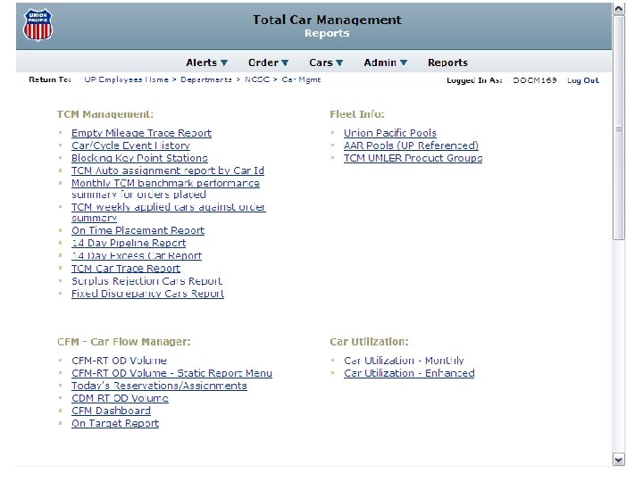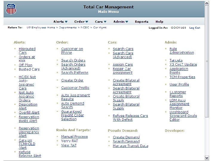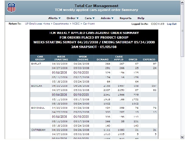 Total Car Management • TCM flows cars based on ‘known’ demand applies cars to orders prior to serving yard – – – Generates demand-based car flows Groups cars by similar characteristics Dynamically assigns cars to customer orders Monitors empty equipment enroute to shippers Identifies failures and takes corrective action Provides ‘Alerts’ and Reports for managing fleets