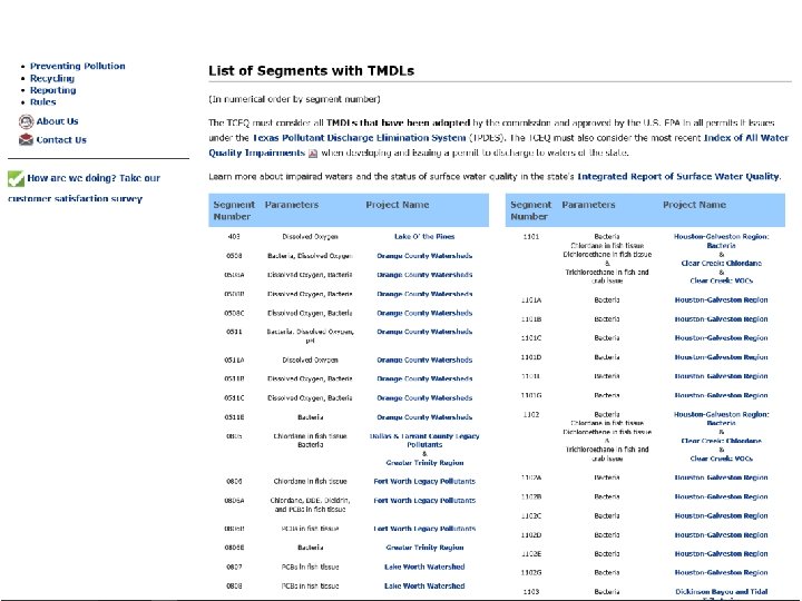 Texas TMDL Program Ø Section 303(d) of the federal Clean Water Act Ø Texas Integrated Report of Surface Water Quality – State of Texas 303(d) List Ø Texas Surface Water Quality Standards (TAC 307. 1 -307. 10) Ø Texas Surface Water Quality Monitoring Program & Texas Clean Rivers Program Ø Total Maximum Daily Loads (TMDLs)