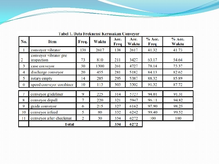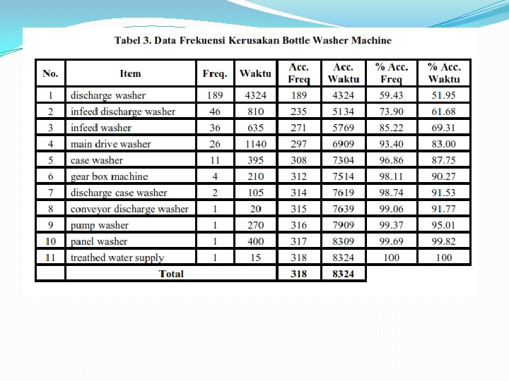 PROBLEM �Sistem produksi PT. CCAI-Cikedokan Plant menggunakan 3 line mesin, yaitu line 1, line 2, dan line 4. �Dari keseluruhan sistem produksi, line 2 merupakan line memiliki tingkat produktivitas yang lebih tinggi dan menghemat waktu produksi dengan kecepatan produksi yaitu 800 bpm (bottle per minute) �Seringnya breakdown mesin terjadi pada Line 1 Frestea 500 ml x 24, (khususnya pada conveyor, filler machine, dan bottle washer machine) memiliki dampak yang signifikan terhadap hasil produksi.