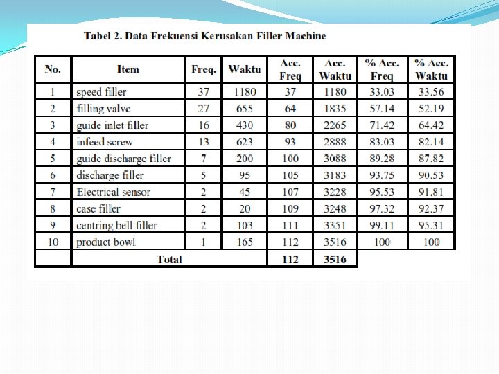 REKAPITULASI PERFORMANCE MAINTENANCE Bulan MTBF (menit) MTTR (menit) Aviability (%) Mei 150. 11 26. 50 84. 99 Juni 110. 98 17. 43 86. 43 Juli 119. 15 15. 64 88. 39