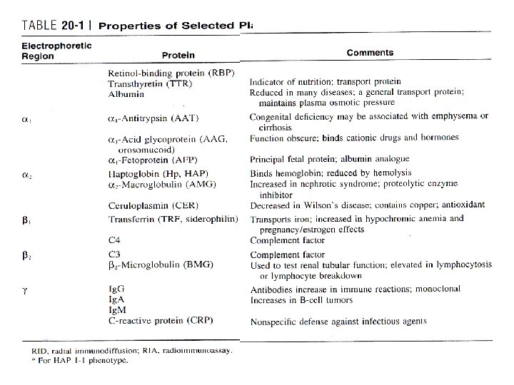 ANALYSIS OF PROTEINS Methods • Specific quantitative assays (Individual proteins) – Immunochemical methods • • • Nephelometry Turbidimetry RID Electroimmunoassay RIA or enzyme immunoassay (EIA) – very low concentrations • Detection and identification – Electrophoresis • Quantitative measurements of total protein