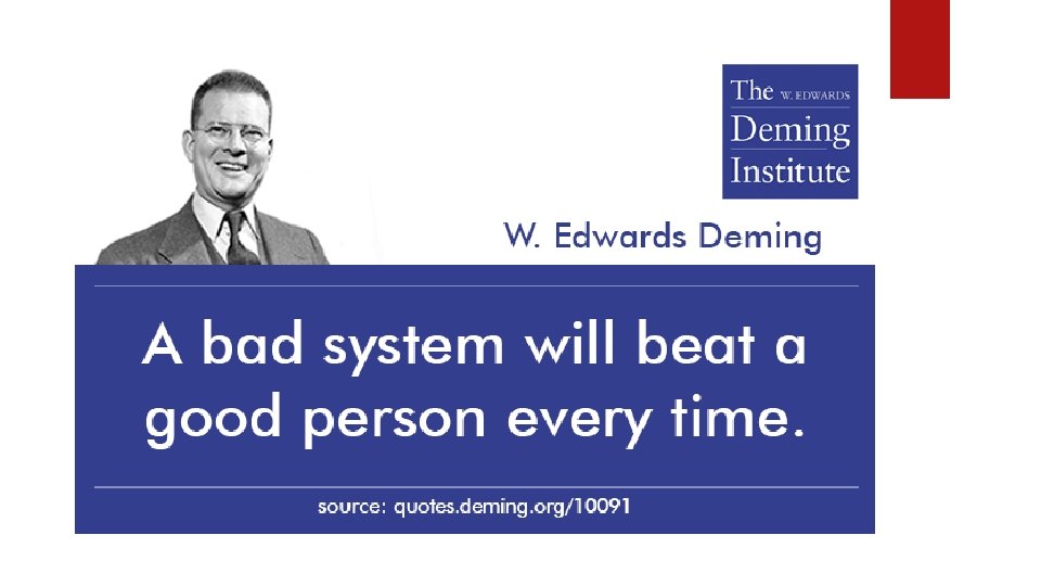 The 14 Points of Dr. Deming 8. DRIVE OUT FEAR No one can work effectively in an environment of fear Love, Loyalty, Cooperation Mistakes are the fault of the SYSTEM