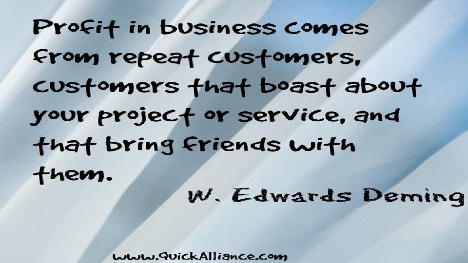 The 14 Points of Dr. Deming 4. End the Practice of awarding business on the basis of price tag alone Instead, minimize TOTAL cost Move toward a SINGLE SUPPLIER Develop long-term RELATIONSHIP of TRUST & LOYALTY