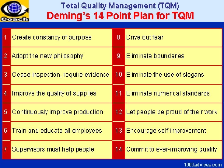LAHIRNYA KONSEP TQM • TQM bermula di Amerika Serikat selama PD II, ketika W. Edwards Deming menolong para insinyur dan teknisi untuk menggunakan teori statistik untuk memperbaiki mutu produksi. • Setelah perang, teorinya banyak diremehkan oleh perusahaan Amerika,