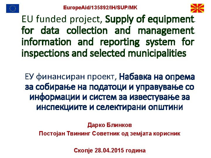 Total value: 750. 000 EUR, Lot 1, Lot 2 and Lot 3 Вкупна вредност: 750. 000 ЕВРА, Три дела LOT 1: Supply of equipment for data collection and management information and reporting system for inspections and selected municipalities/Набавка на опрема за собирање на податоци и управување со информации и систем за известување за инспекциите и селектирани општини LOT 2: Supply of IT (hardware and software) equipment/Набавка на ИТ (хардвер и софтвер) опрема LOT 3: Road vehicles/Патнички возила