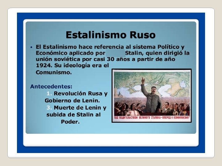 v Nazismo: Doctrina política e ideología de carácter totalitario, nacionalista y expansionista, además de racista y antisemita; fue impulsada en Alemania por Adolf Hitler. v Stalinismo: Modelo político totalitario implementado por Josef Stalin quien pretendía consolidar el comunismo. El Estado controlaría a partir de entonces toda la actividad y establecería las directrices a seguir. v Nacionalismo : es una ideología, basada en la creencia en la existencia de ciertas características comunes e identitarias en una comunidad nacional. v Racismo: es una forma de discriminación centrada en diferencias biológicas, reales o imaginarias, que se hacen extensivas a signos o indicadores culturales o religiosos. Constituye una ideología que apeló a la biología para establecer relaciones jerarquizadas de desigualdad entre grupos humanos. v Antisemitismo: prejuicio u odio a los judíos basado en una combinación de prejuicios de tipo religioso, cultural o étnico.