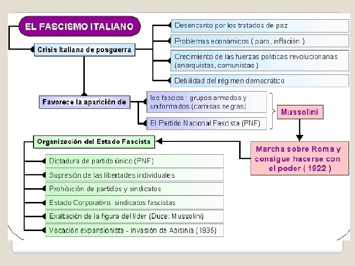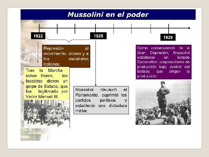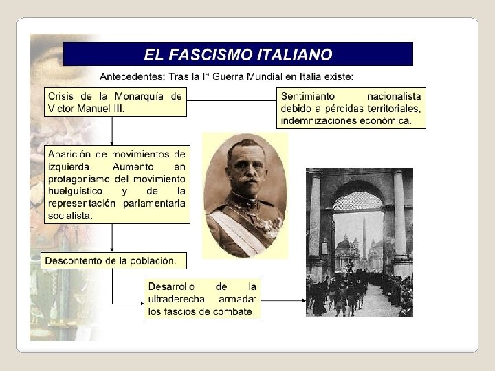v Régimen político: Es la forma en que se organiza el poder dentro de un Estado. v Totalitarismos: El totalitarismo es una forma de Estado que se caracteriza por una forma de gobierno antidemocrática donde se limita la libertad y los derechos individuales. Representa un proyecto de fusión entre el Estado y la sociedad. Los totalitarismos consideran al Estado como un fin en sí mismo, Mussolini graficó esto en el eslogan "todo en el Estado, todo para el Estado, nada fuera del Estado, nada contra el Estado". No es ya el Estado para el hombre, sino el hombre para el Estado. v Fascismo: Es un movimiento político y social de carácter totalitario y nacionalista. Surgido en Italia con Benito Mussolini.