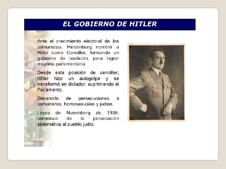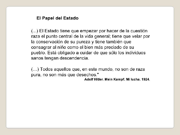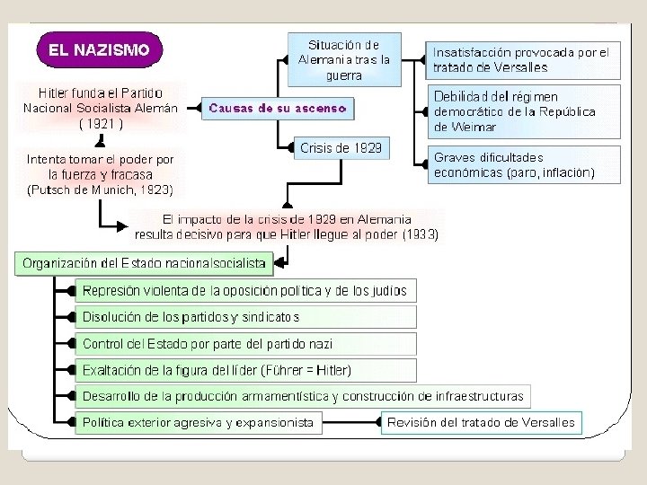 Recordemos las características de los sistemas Totalitarios: § El Estado intervino en todos los ámbitos de la vida (la escuela, la juventud, la vida laboral y empresarial, el mundo femenino, los medios de comunicación, etc. ), coartando la libertad de los individuos. § En el fascismo las personas se subordinaban plenamente al Estado. (Subordinación del individuo al Estado) § El partido oficial era la única organización política permitida. (Partido único) § El fascismo concebía la sociedad como una organización militar. En ella cada individuo debía ocupar un lugar determinado y desarrollar una función específica. La jerarquía, el mando y la disciplina debían regir el funcionamiento social. (Grupos paramilitares) § La unidad nacional en torno al estado, al partido único y al líder será la máxima aspiración de la ideología fascista. (Nacionalismo y expansionismo) § Se organizaron en torno a la figura de un jefe ("Duce, Führer, Caudillo") con poderes absolutos sobre el partido, el estado y la sociedad. (Líder carismático) § Utilizaron masivamente la propaganda para inculcar los valores de su ideología. (Uso de la propaganda, radio y prensa escrita) § La ideología fascista era totalmente contraria a la idea de igualdad (Racismo y Xenofobia)
