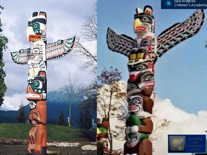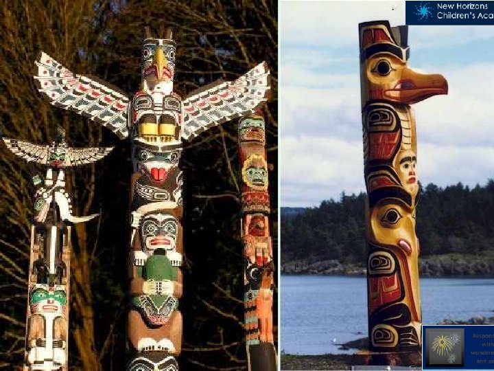Totem poles They are wooden towers, carved with images of animals and symbols, were monuments expressing a family's status (how high or low they were in social ranking) within a tribe.