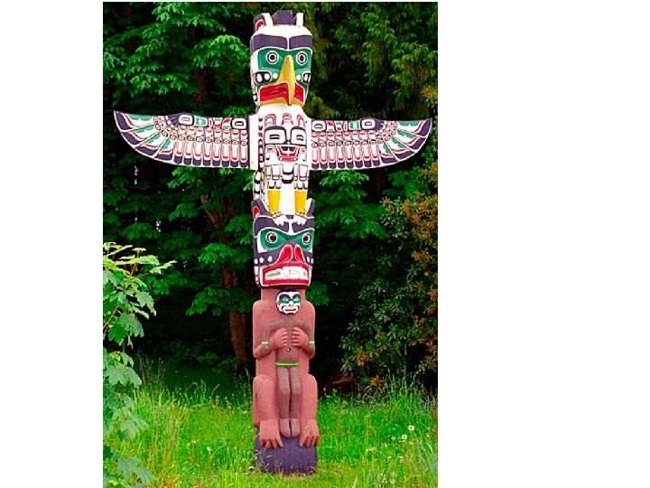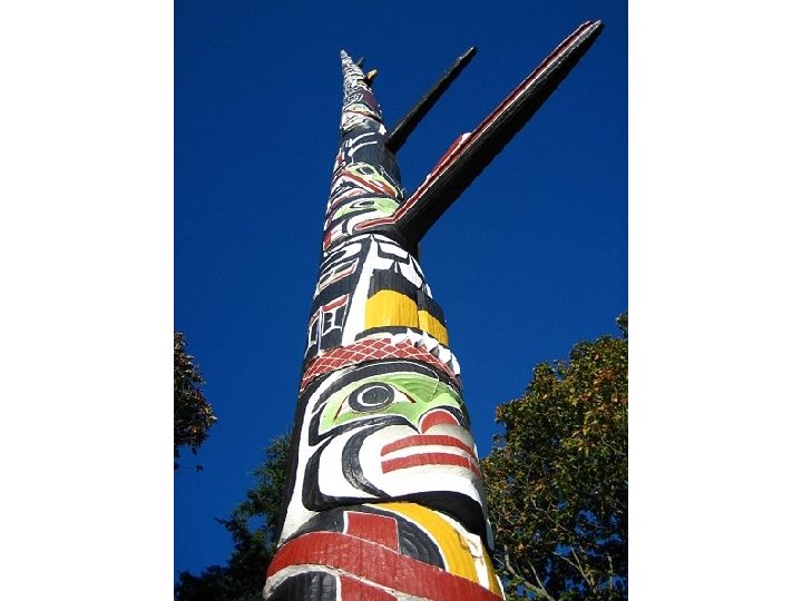 Totem poles • The purpose of the totem poles varies among the tribes. • Some are made for the cultural message, while others are made only for the artistic presentation. • They can be used to illustrate stories, commemorate historical persons or to represent shamanic or spiritual powers. • What’s important to remember is that they were NEVER made as objects of worship.