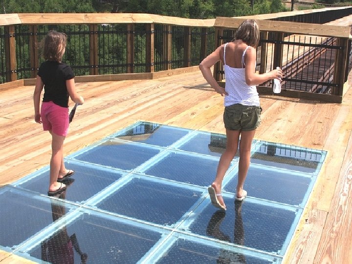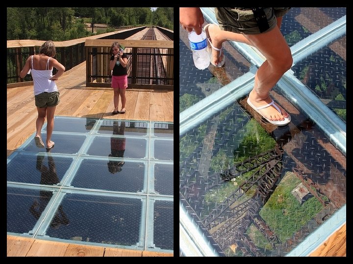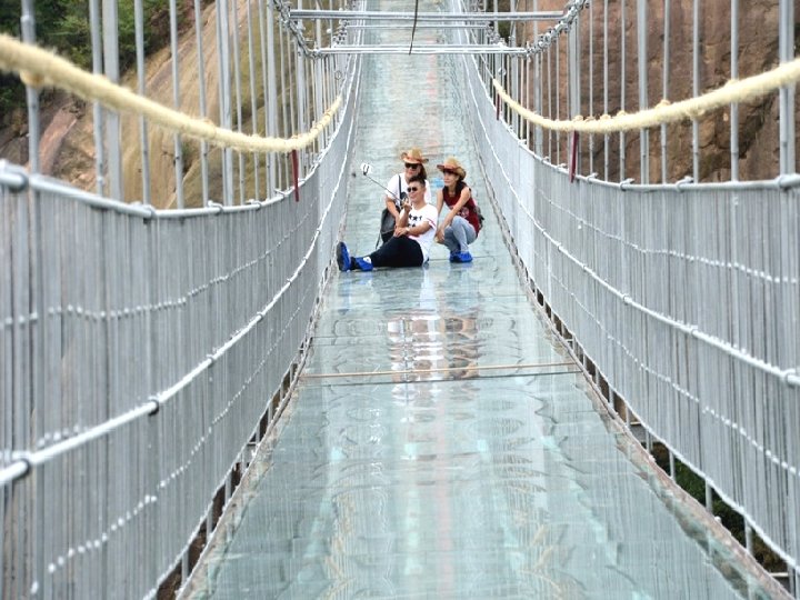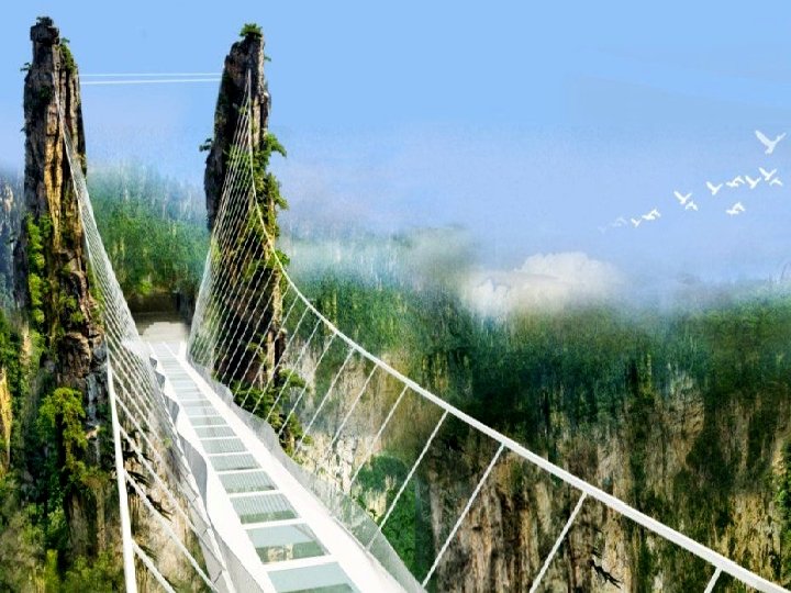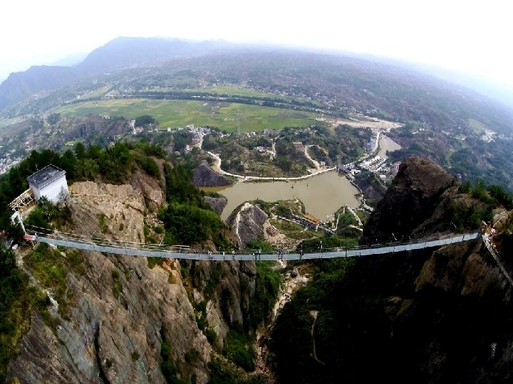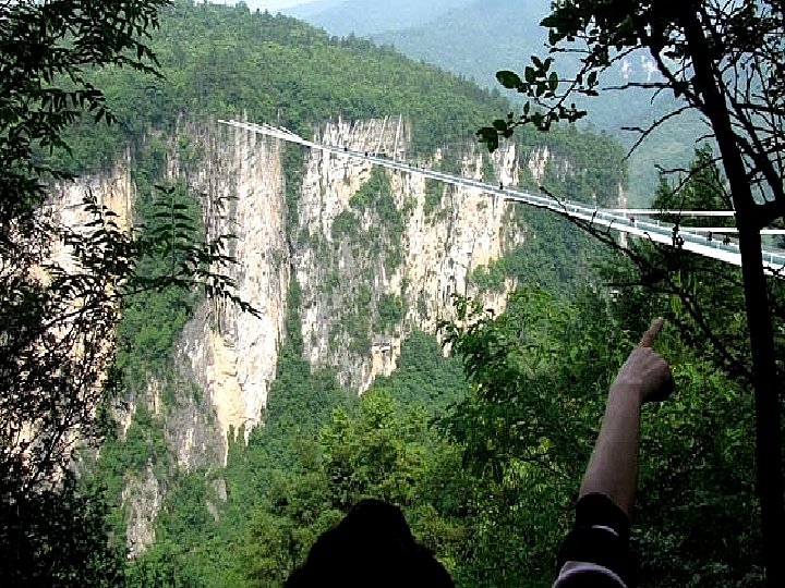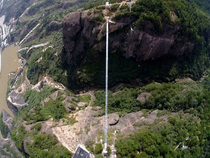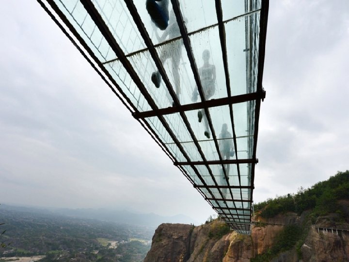 Le pont de verre Zhangjiajie (Chine) le plus long (430 mètres) et le plus haut du monde (300 mètres) offre une vue verticale impressionnante sur la rivière au-dessous. Avec 6 mètres de large peut accueillir 800 personnes en même temps