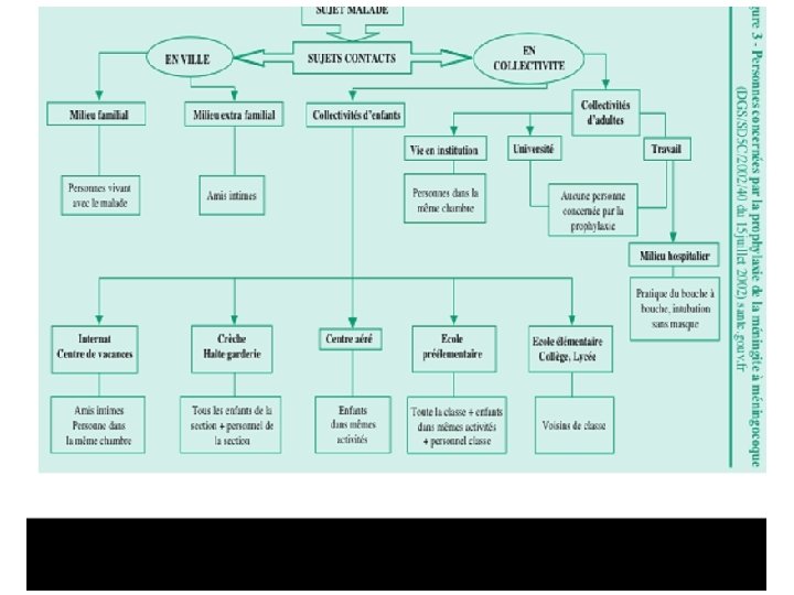 Vaccins anti-méningococciques • Vaccin (non conjugué) polyosidique A + C – Voyageur en zone de gde endémie – Masse en cas d’épidémie – Prévention dans entourage d’un cas • Vaccin (non conjugué) polyosidique A, C, Y, W 135 – Mencevax®, > 24 mois – Voyageurs, Mecque, entourage si Y ou W 135 • Vaccin oligosidique conjugué = protéine porteuse groupe C – Méninvact®, Méningitec®, Menjugate®, Neisvac®, > 2 mois • Vaccin oligosidique conjugué tétravalent, > 11 ans