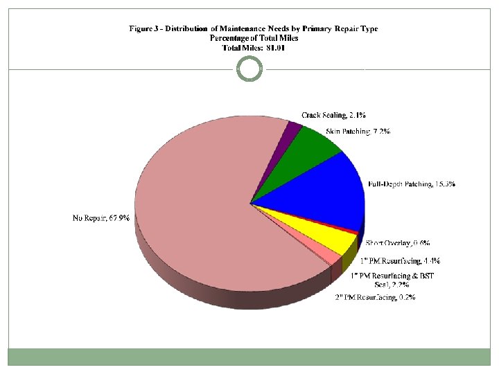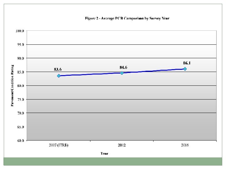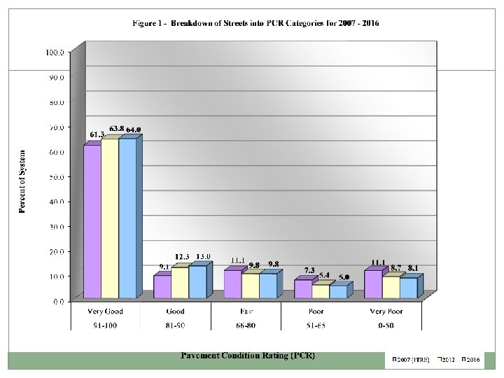 Findings 1. PCR = 86. 1 2. NC Municipality Average = 80. 0 3. Street System is in “Good” condition 4. PCR is above average 5. 32. 1% of street system needs maintenance or resurfacing 6. NC Municipality Average = 47%