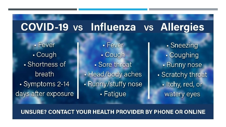 WHAT TO DO IF YOU THINK YOU HAVE BEEN EXPOSED… Self isolate, stay at home for 14 days and monitor your symptoms (AVOID CONTACT WITH OTHERS AND DO NOT TRAVEL) As much as possible, stay in a specific room and away from other people in your home, if possible, use a separate bathroom and do not handle animals. Call your doctor and notify them of your symptoms (DO NOT SHOW UP TO YOUR DOCTOR’S OFFICE WITHOUT CALLING FIRST) If your symptoms progress to severe difficulty breathing or extremely high fever that isn’t responding to OTC medications, call 911 or your local emergency room If you have underlining chronic health conditions, such as diabetes, COPD, people with compromised immune systems, smokers, and the elderly are at greater risk for severe symptoms