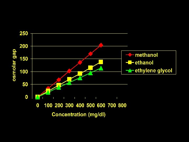 Substance Methanol Ethylene glycol Acetone Isopropanol Salicylate * At 100 mg/dl Mole Wgt 32 46 62 58 60 180 m. Osm/L* 34 23 19 18 18 6