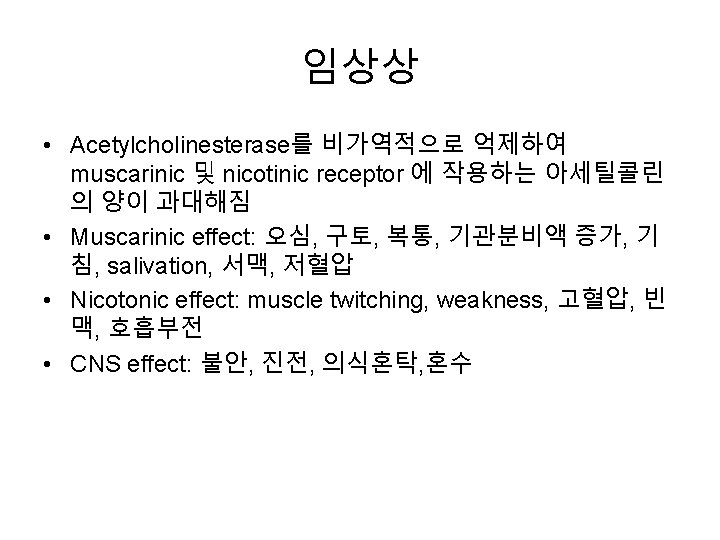 치료 • Decontamination: 피부, 위장관 세척 • 아트로핀: muscarinic effect 치료 • Pralidoxime(2 -PAM): cholinesterase 를 reactivation 시키 면서 nicotinic symptom 치료제임