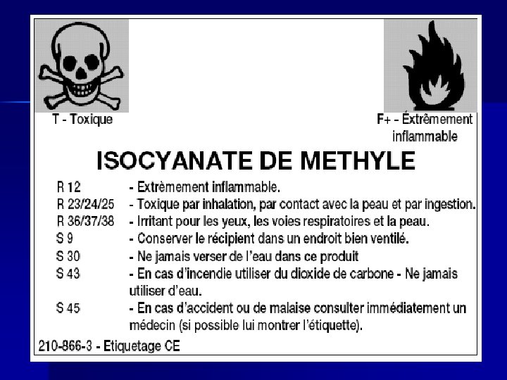 n L'isocyanate de méthyle (MIC Methyl isocyanate) est un intermédiaire utilisé pour la fabrication de pesticides de la famille des carbamates ( H 3 CN=C=O). n L'isocyanate de méthyle se présente sous la forme d'un liquide incolore très volatil, d'odeur particulièrement âcre. n Egalement présent dans la fumée de cigarettes