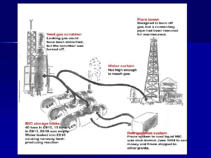 Infiltration d’eau dans un réservoir contenant du methyl isocyanate n Défaillance des systèmes de sécurité n Explosion et formation d’un nuage de MIC très toxique n Grosse densité de population n