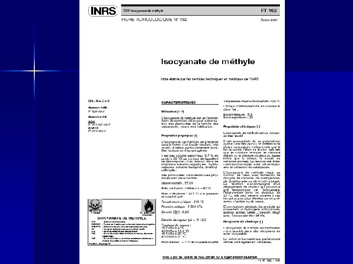 Toxicité de l’isocyanate de méthyle n Extrêmement irritant pour la peau et les muqueuses – Brûlures cutanées – Brûlures cornéennes – OAP – Nausées, vomissements, diarrhées