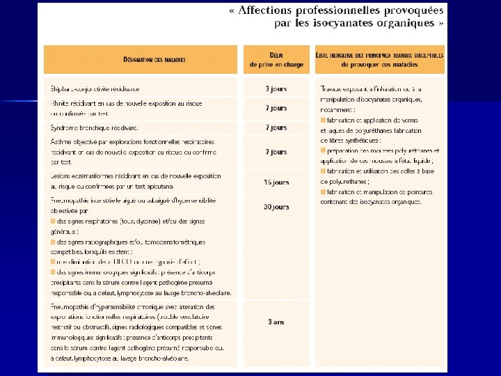 Particularités de l’asthme aux isocyanates – Tableau très inflammatoire, très réactif, symptomatologie explosive – Relation temporelle à l’exposition très nette – Sévère une fois installé (cas d’asthme mortel) – Régression des symptômes que dans 30% des cas après éviction – Persistance d’une hyperréactivité bronchique plus de 10 ans après l'arrêt de l'exposition – Plus le diagnostic est précoce et plus l’éviction est faite rapidement, moins sévère sera le pronostic