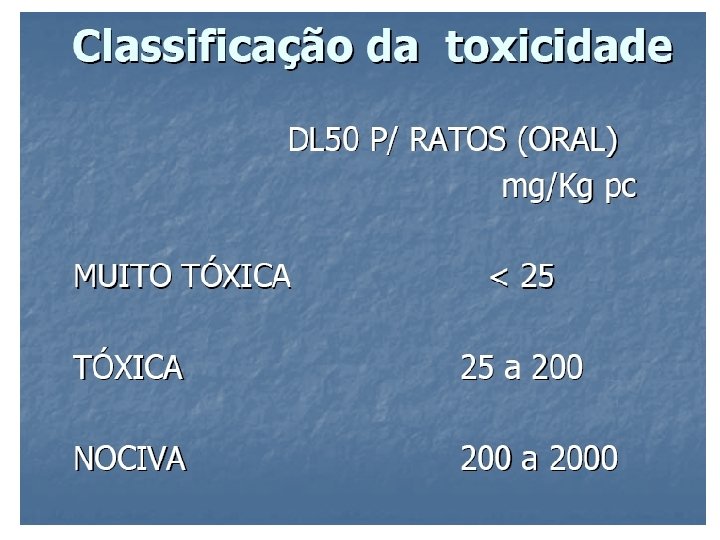 Conceitos • Risco: probabilidade de que um efeito adverso ocorra devido à exposição a uma substância química. • Riscos aceitáveis: probabilidade de que um efeito ou dano seja tolerado por um organismo. Ou seja, que o benefício real trazido pelo uso da substância seja maior do que o risco. • Toxicidade: A toxicidade de uma substância é a capacidade de causar um efeito nocivo ou morte aos organismos vivos.