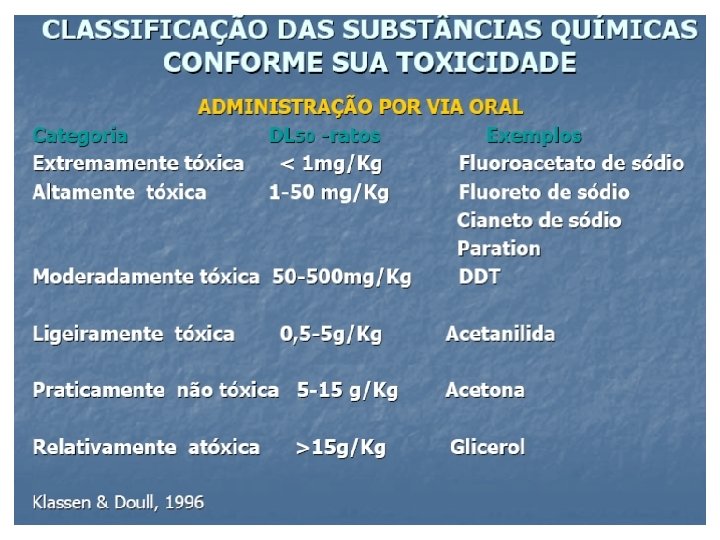 Toxicidade Depende: “Tudo pode ser tóxico! A toxicidade depende da dose” (Paracelsus séc. XVI) Dose : quantidade de uma substância química administrada a um organismo vivo. Expressa em unidade de peso corpóreo. Via de administração: dérmica, parenteral. respiratória, Frequência de exposição: doses únicas ou múltiplas.