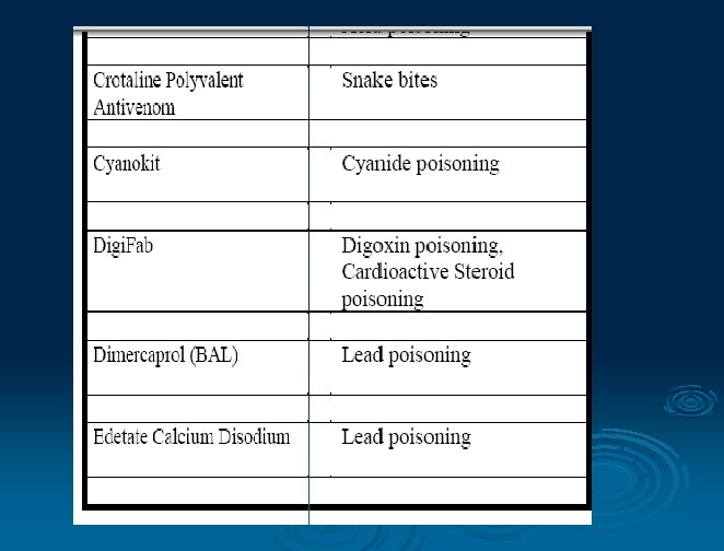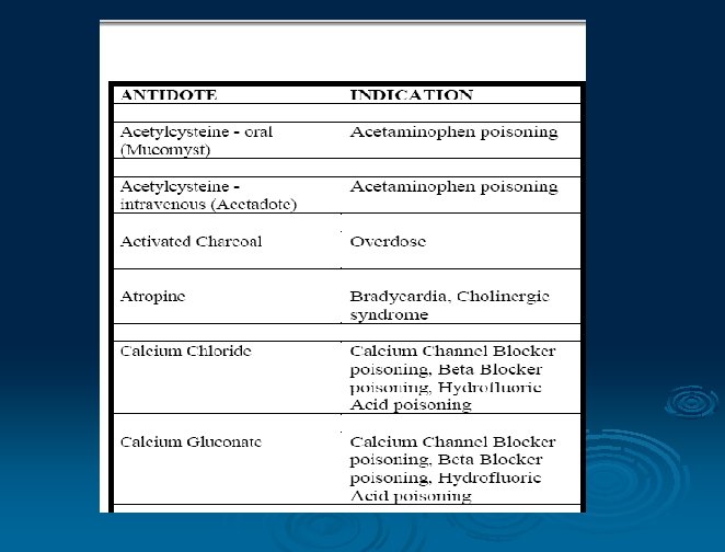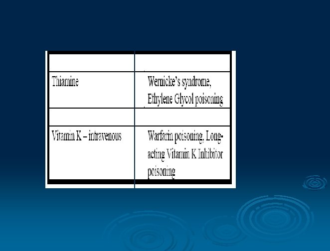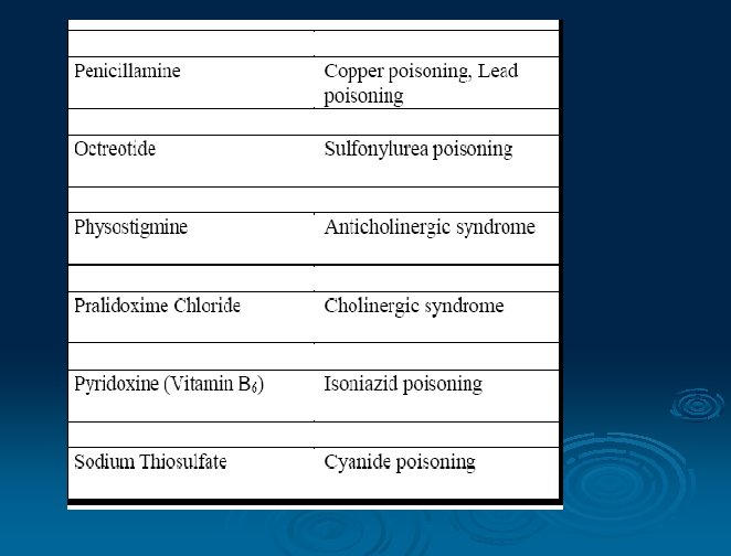 Initial Management of the poisoned patient (ABCD’s) First, the airway should be cleared of vomitus or any other obstruction and an oral airway or endotracheal tube inserted if needed. • Breathing should be assessed by observation and oximetry and, if in doubt by measuring arterial blood gases patients with respiratory insufficiency should be intubated and mechanically ventilated • Circulation should be assessed by continuous monitoring of pulse rate, blood pressure , urinary output. An intravenous line should be placed and blood drawn fro serum glucose and other routine determinations • Dextrose to treat hypoglycemia (0. 5 gm/kg) •