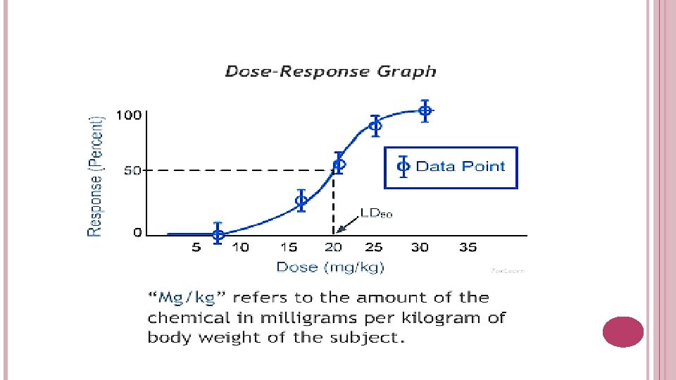 MEASUREMENT OF ACUTE TOXICITY: Lethal � This dose (LD 50): is defined as the dose required to kill half the members of a specific animal population when entering the animal’s body. � LD 50 is stated in milligrams per kilogram (mg/kg): milligram of chemical per kilogram of body weight The lower the LD 50 --the lower the lethal dose-the more toxic the substance. The term LC 50 -Lethal Concentration is used to measure the toxicity of gases. The LC 50 is stated in milligram of chemical per liter (or cubic meter) of air.