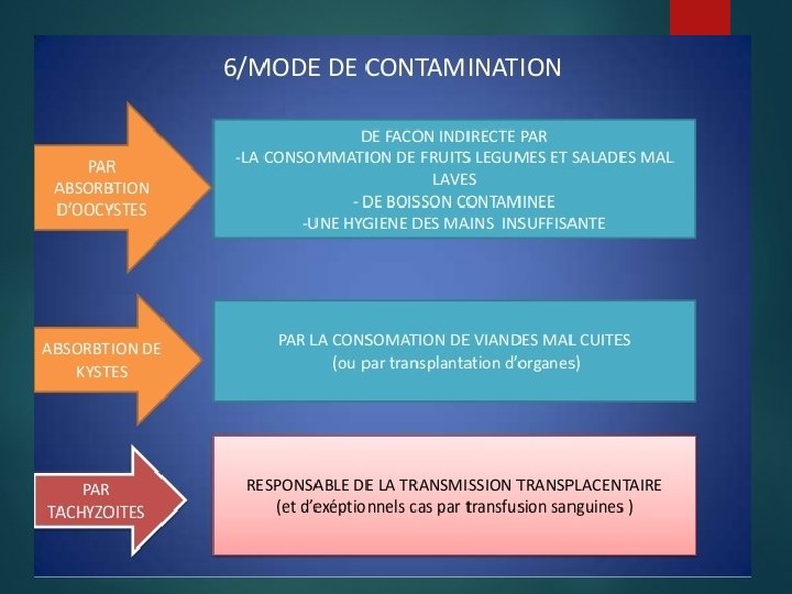Epidémiologie: Modalités épidémiologiques Facteurs de risque: *Contact avec le sol, *Ingestion de viande peu cuite, *Absorption d’eau non filtrée, *Non lavage des mains et des légumes.