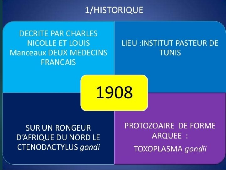 Historique Toxoplasma mots grecs toxon : arc plasma : forme Après une épidémie de laboratoire sur un rongeur sauvage : Ctenodactylus gundi