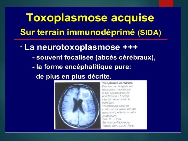 Toxoplasmose de l’ ID Toxoplasmose cérébrale Imagerie cérébrale (TDM-IRM) : des lésions focalisées sus tensorielles , très évocateur d’ abcès uniques ou multiples entourés d’un halot inflammatoire ou parfois d’ effet de masse. Cet examen est demandé devant toute symptomatologie neurologique afin de mettre un TRT précoce.