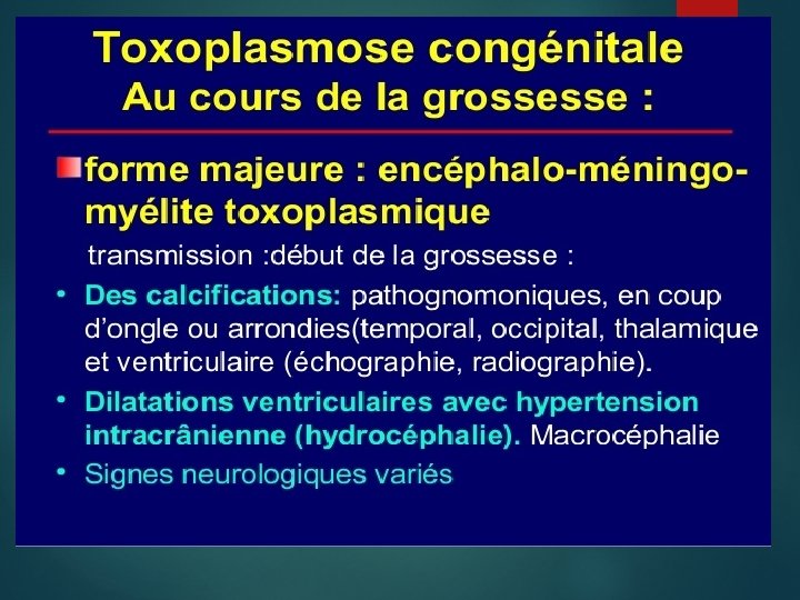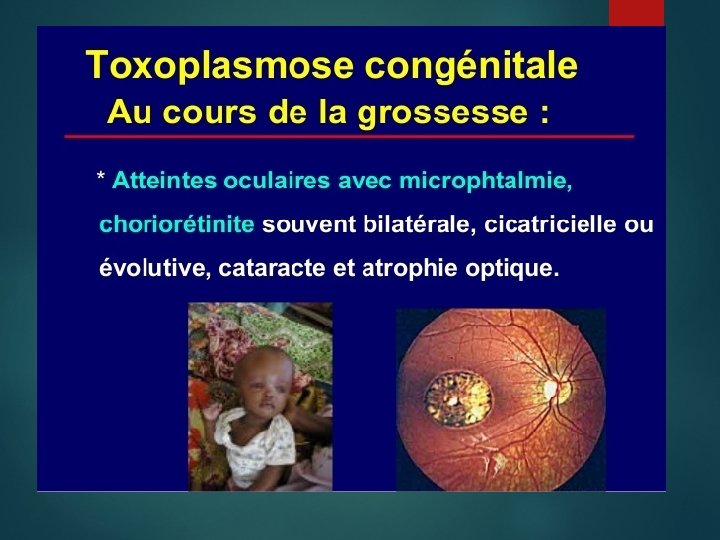 Toxoplasmose congénitale au cours de la grossesse Les formes retardées En fin de grossesse : la plupart des enfants infectés feront des formes bénignes ou inapparentes Secondaires à une contamination in utéro encore plus tardive Comprennent un des signes suivant : *Retard psychomoteur. *Périmètre crânien augmentant plus rapidement que la normale. *Crises convulsives. *Apparition tardive d’ un foyer de choriorétinite peuvent ne se révéler que très à distance de la naissance (7 ans).