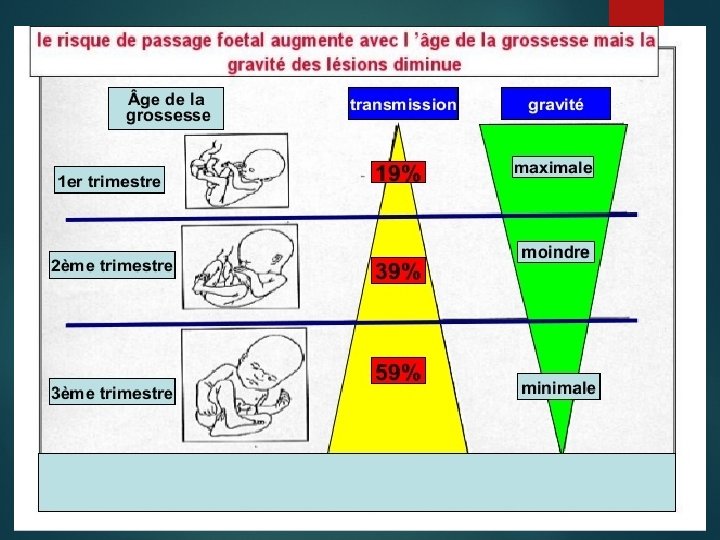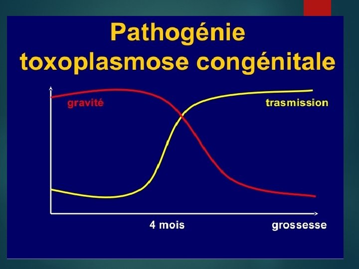 Toxoplasmose congénitale en période périconceptionnelle Rare mais si elle survenait très grave abortive ou malformative. – une relation inverse entre la fréquence de transmission au fœtus : maximale a la fin de la grossesse et la gravité de la maladie congénitale : plus grave au cours des 2 er trimestres Détectable à l’échographie et justifiant l’ interruption thérapeutique de la grossesse.