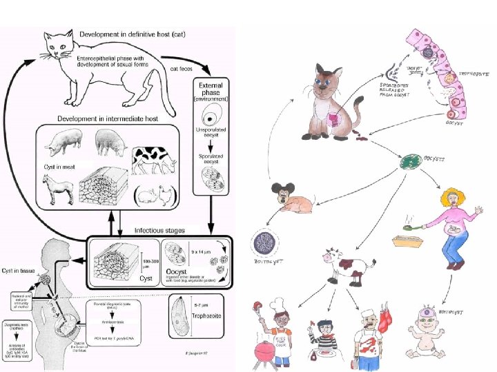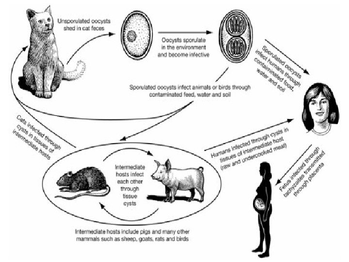 PATOGENESIS • Toxoplasma berbiak di dalam sel darah putih (leukosit), berbagai jaringan dan cairan tubuh. • Diduga toxoplasma dapat ditularkan melalui insekta penggigit/penghisap darah. • Siklus hidup toxoplasma ada 3 stadium: – 1. bentuk Takisoit yg aktif di dlm darah, urine, air mata, air liur, cairan sperma, feses dan cairan tubuh lainnya. – 2. bentuk Bradisoit yg inaktif dlm jaringan , otak, otot jantung, hati, mata, organ pencernaan dll. – 3. bentuk Ookista yg hanya terdapat di dlm feses bangsa kucing(felidae). merupakan bentuk paling berbahaya karena dalam waktu 48 jam ookista dlm feses dapat bersporulasi menjadi bentuk sporozoit yg siap menginfeksi calon korban berikutnya termasuk manusia bila termakan bahan makanan atau minuman yg tercemar oleh sporozoit tsb.