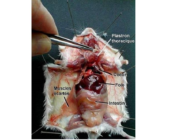 Fixer la souris sur le dos à l'aide d'épingles enfoncées obliquement dans les pattes.