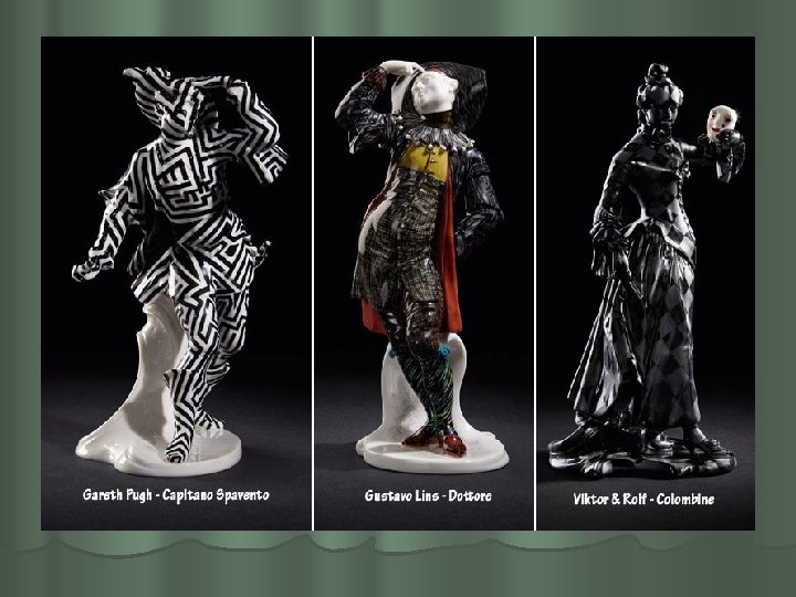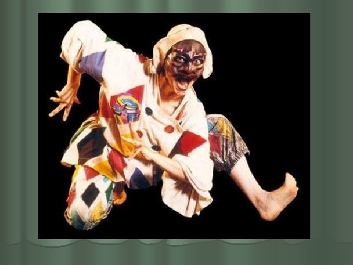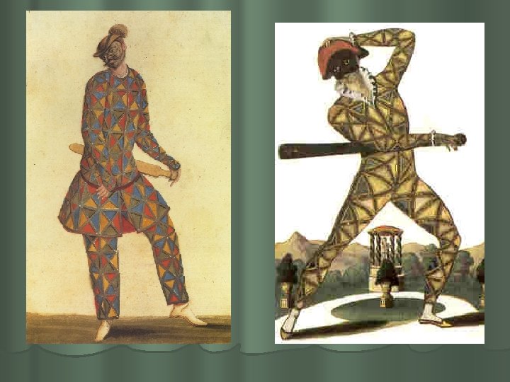 Kirjudes riietes (viitab vaesusele ja ihnsusele) mustas poolmaskis esines Arlecchino – veiderdav juhmard ja narr, kes ilmus teatrisse suhteliselt hilja: XVI saj lõpus – XVII saj alguses. l Temast on tulnud üldnimi „arlekiin”. l