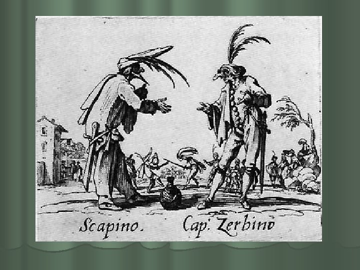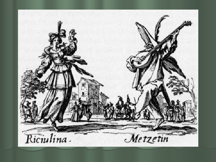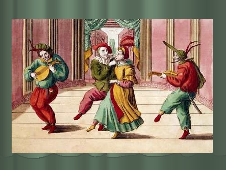 XVI sajandi keskpaiku tekkis Itaalias omalaadne ja algupärane rahvalik teater - commedia dell´ arte (it. k ‘kunstikomöödia’) , mis kasvas välja laadapalaganist ja kevadistest karnevalidest, levis rändteatritega Madridist Peterburini ning oli väga populaarne. l Žanri on nimetatud ka “improvisatsiooniliseks komöödiaks”, “maskikomöödiaks”, “süžeekomöödiaks” , “itaalia komöödiaks” jne. l Erinevalt keskaegsest teatrist, kus näitlejad olid asjaarmastajad (tsunftitöölised, üliõpilased), koosnesid commedia dell´arte näitetrupid elukutselistest näitlejatest. Nimetus ise (sõna-sõnalt `kunstikomöödia`) rõhutas teatri kutselisust, professionaalsust. l