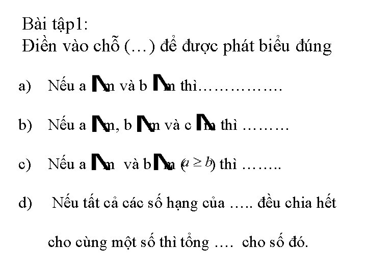 Bài tập 1: Điền vào chỗ (…) để được kết luận đúng. a) Nếu a m và b m thì ( a + b ) m b) Nếu a m, b m và c m thì ( a + b + c ) m c) Nếu a d) Nếu tất cả các số hạng của tổng đều chia hết m và b m thì ( a – b ) m cho cùng một số thì tổng chia hết cho số đó.