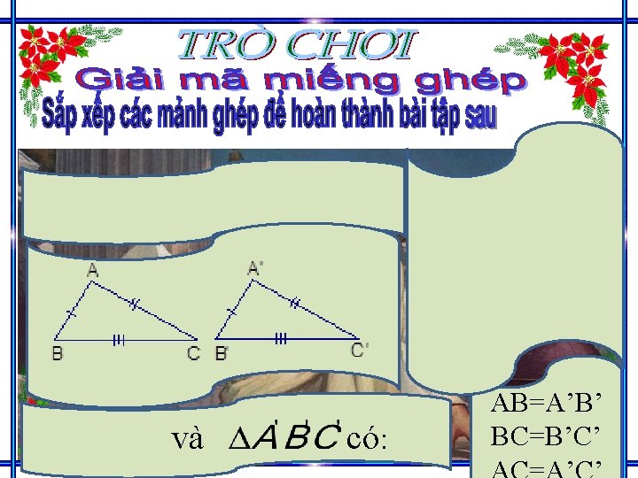 Lời giải: 1 2 Do đó (c. c. c) AB : cạnh chung AC = AD (gt) BC = BD ( gt) 3 Suy ra (2 góc tương ứng) 4 Do đó (c. c. c) 5 6 và Suy ra và có: AB : cạnh chung AC = AD (gt) BC = BD ( gt) Dođó (c. c. c) Suy ra (2 góc tương ứng) có:
