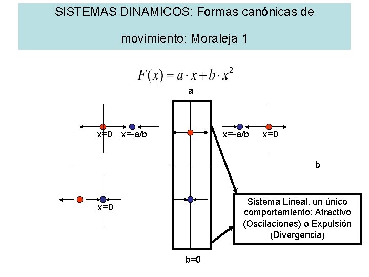 SISTEMAS DINAMICOS: Formas canónicas de movimiento. Moraleja 2 a x=0 x=-a/b La estabilidad (atractivo o x=-a/b repulsivo) esta dado solo por el termino lineal x=0 b (a). x=0 b=0