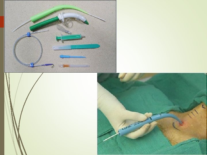 Surgical vs Percutaneous Bedside Percutaneous Tracheostomy first performed by Ciaglia in 1985. Absolute contraindications: need for an emergency airway in a pt with a tracheal tumour, children <12 yrs – soft tracheal cartilage – increased risk of injury. Relative contraindications: coagulopathy, active infection over neck, unstable C-spine, morbid obesity, anatomical distortion, previous neck Sx / Rx, trauma or burns to neck, high PEEP or Fi. O 2, elevated ICP. Proposed advantages: relatively simple procedure, easier to perform, shorter procedure time, eliminates time, cost and morbidity associated with transfer to theatre. RCT’s comparing surgical and percutaneous tracheostomies: Advantage for percutaneous in terms of: wound infection, bleeding, mortality and scarring Equivocal in terms of: false passage and subglottic stenosis. Disadvantage in terms of: decannulation / obstruction. Comparison of the various percutaneous techniques has demonstrated that a single-step dilator technique is the most reliable in terms of safety and success rate. Other questions: Bronchoscope USS of neck LMA vs ETT